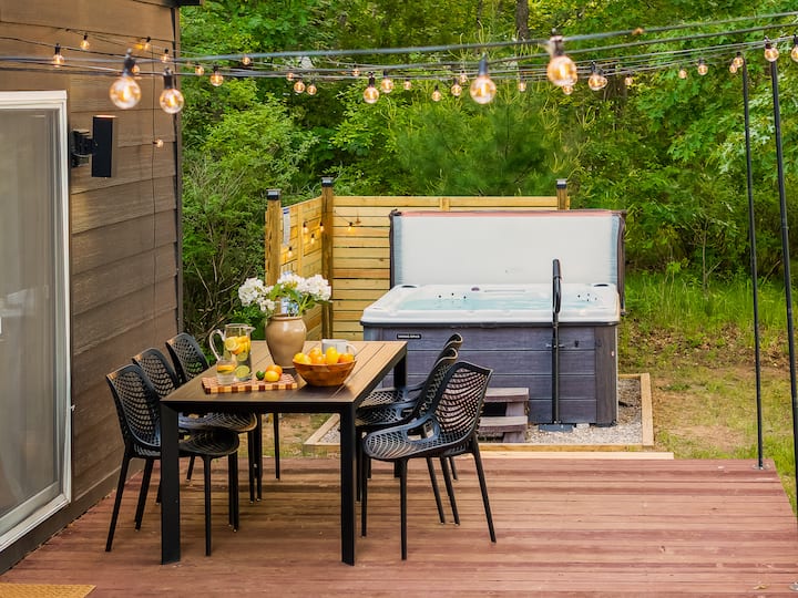 带热水浴缸和火坑的舒适河滨小屋