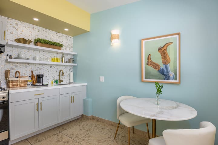 在奥黛丽套房( Audrey Suite )成为您自己的缪斯,永恒的风格与棕榈泉的魅力相遇。 这间优雅的套房设有全功能厨房、独立卫生间和宁静的私人后院,非常适合单身女郎之旅、浪漫度假或放松的女孩周末。 您可以轻松前往我们宁静的庭院加热泳池,距离充满活力的棕榈泉市中心仅几分钟路程。