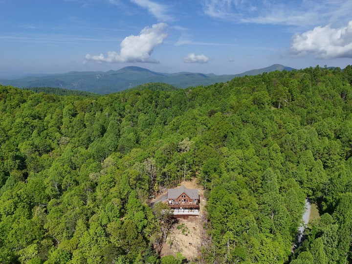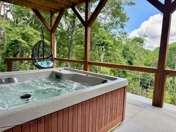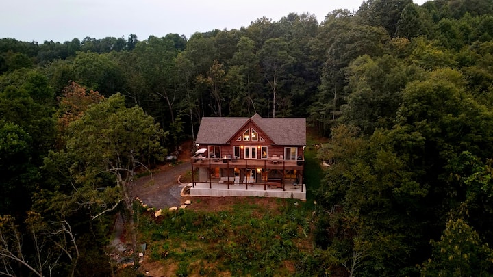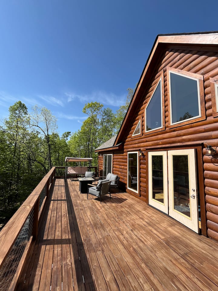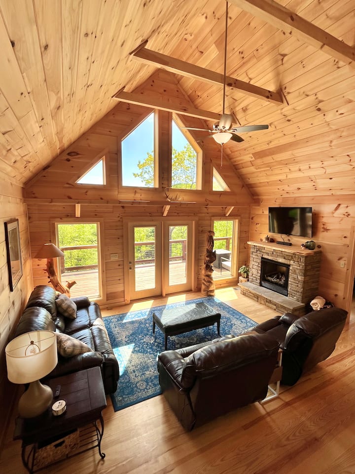 宽敞的小木屋,山景,热水浴缸,火坑