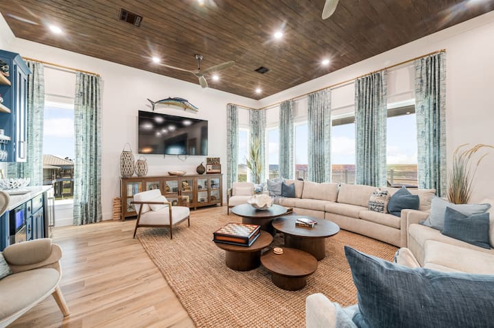 在露台上享用私人泳池,配备日光浴躺椅,从部分遮阳的露台欣赏壮丽的日出景观,这里是享用晨间咖啡或夜间鸡尾酒的完美场所。 室内设有宽敞的开放式起居区、餐厅和厨房空间,配备无线网络和智能电视。 楼上还有一个方便的吧台,楼下设有配备炉灶、冰箱和大型制冰机的全套户外厨房,非常适合钓鱼旅行或户外盛宴。