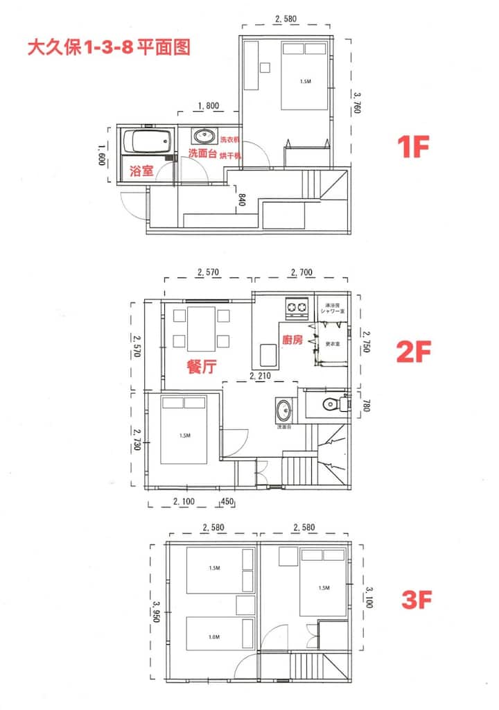 ・3楼:两间卧室,一间卧室1张双人床(1.5x2米)和1张单人床(1x2米),另一间卧室1张双人床(1.5x2米)和1张地垫单人床(1.5x2米)