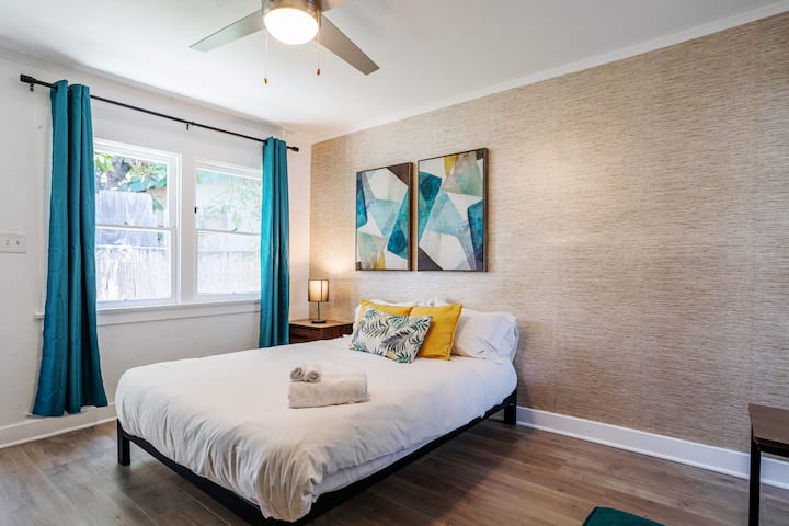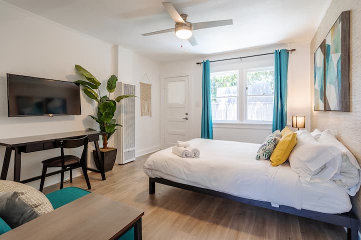 舒适的卧室配有记忆泡沫标准双人床,确保在探索城市一天后睡个好觉。 宽敞的窗户允许自然光,而全长窗帘可供选择遮挡阳光,以获得额外的睡眠。 单间公寓设有窗口空调。在我们的Roku智能电视上登录您的Netflix、HBO和其他流媒体服务。 房源各处均配备高速无线网络。