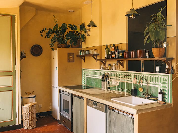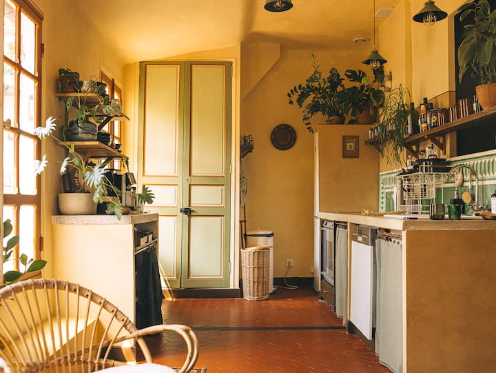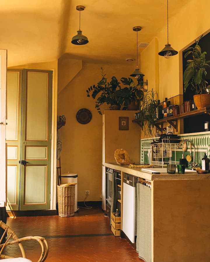 这套75平方米的公寓位于典型的19世纪马赛建筑的4楼,没有电梯,将旧式魅力(地砖、石灰墙)与现代环保的布局相结合,采用天然材料,并有许多植物。