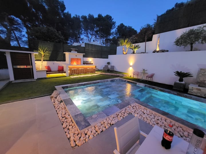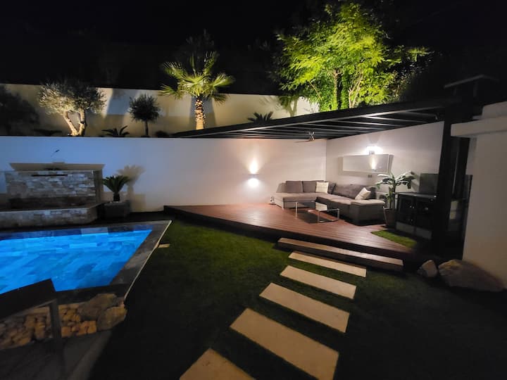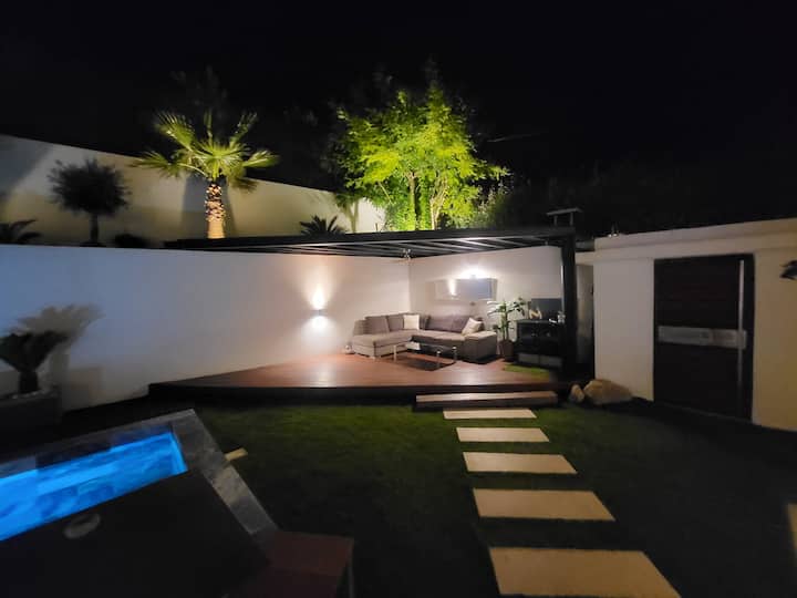 110平方米的花园,包括14平方米的朝南露台,可直接通往客厅/厨房,目前漂亮、干净、有围栏、草坪,配备了新设备( 1张柚木桌240厘米+6张椅子、1张烧烤/Plancha、2张日光浴床/日光浴床、4人舒适的户外休息室及其咖啡桌,以及2个大型现代立方锅,包括一个明亮且可调节的锅,其中一个明亮且可调节的锅,可以在您入住期间为您的夜晚打造愉快、筛选和休息室。 在不久的将来,花园将进一步改进,我们将增加一个高档的户外布局,带有66平方米的柚木屋顶露台,可欣赏美丽的无遮挡景观,在花园层,从未来照明的木制/白色鹅卵石露台上出现一棵大棕榈树,该露台将获得最新一代的4座水疗/按摩浴缸,该水疗中心/按摩浴缸将被保护在现代生物气候凉亭下,并精心穿着镜子般的玻璃窗帘,因此您可以全年小心地享受。
