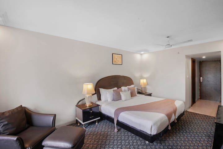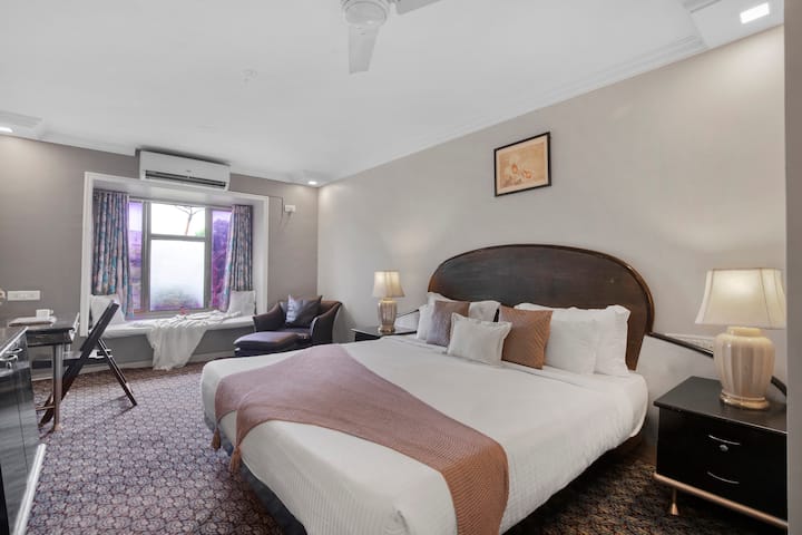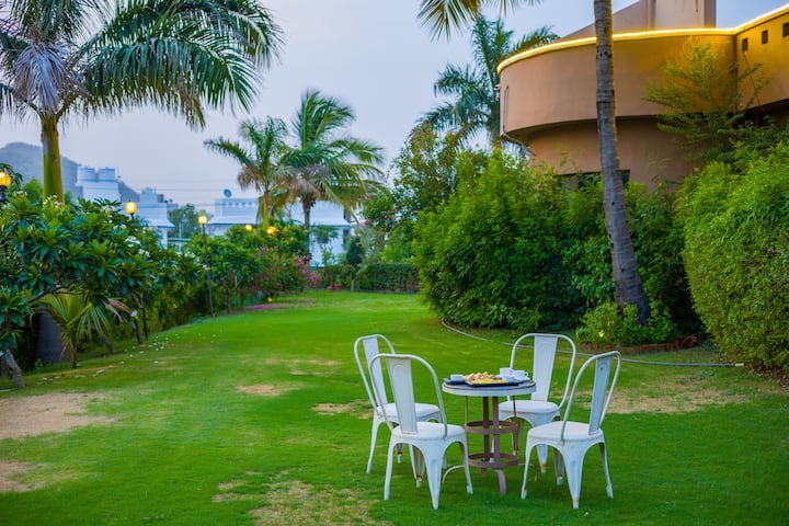 这座度假胜地坐落在宁静的Aravalli庄园内,配备一张标准双人床、一张舒适的沙发和一张窗边座椅,非常适合慵懒地喝咖啡或做日落白日梦。步入共用空间,一个由棕榈树环绕的温柔拱形泳池,露天和室内用餐,以及一个配备酒吧和桌上足球的时尚休息室。庄园设有大厅、派对室或露天剧场,可供夜晚音乐、讲故事或安静狂欢。灯笼照亮的花园欢迎夜晚的谈话,而电动车充电站则让一切变得轻松自如。