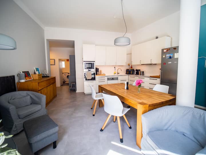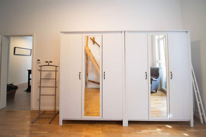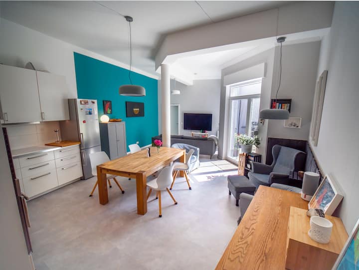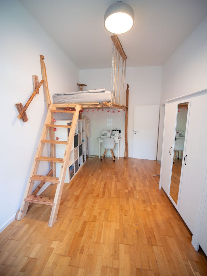 与全家人一起享受城市之旅,在这座城市绿洲中享受宾至如归的感觉,这里有花园和免费停车位,是真正的宝石! 宽敞的一楼公寓(115平方米)设有3间卧室、开放式厨房和客厅,配备舒适的阅读角、电视和Switch游戏空间。 两间卧室的床可通过梯子式楼梯进入,让空间既有趣又独特。
