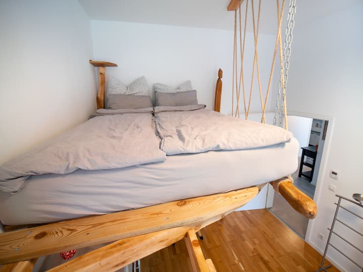第二间卧室面朝花园,提供一个舒适的睡眠角落,140厘米的床架设在木制阁楼上,可通过阁楼梯子进入,增添了一丝真正的柏林风情。