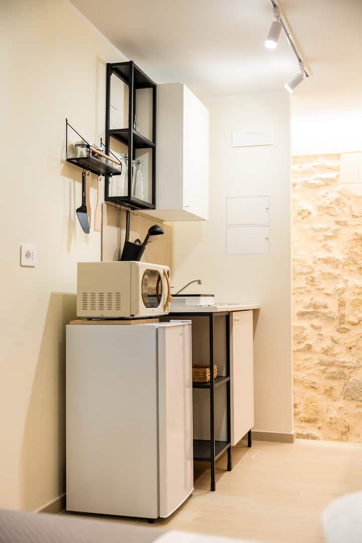 ✓ 小厨房:设备齐全,配备雕塑壁龛、炉灶、冰箱、浓缩咖啡机、微波炉、陶瓷餐具、烹饪所需的一切或简单地煮早餐咖啡