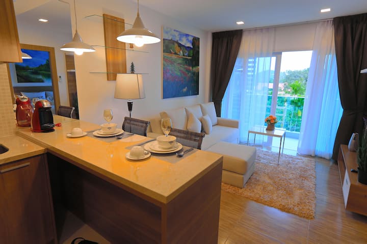 在您入住普吉岛期间,这套公寓将是您的舒适之家。 公寓配有一张加大双人床,客厅里有一张折叠沙发,是带小孩和情侣的家庭的理想选择。 卧室与客厅之间有一扇可以上锁的全门。 您可以从卧室和客厅进入卫生间。 公寓的卧室内还有一个单独的衣柜区域。 宽敞舒适的阳台可俯瞰普吉岛令人难以置信的大自然。