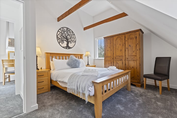 楼上有两间宁静舒适的卧室。 主卧配有一张加大双人床、内置储物柜和时尚的套房淋浴间。 第二间卧室配有舒适的双人床、梳妆台和衣架,非常适合入住几晚或更长时间的房客。