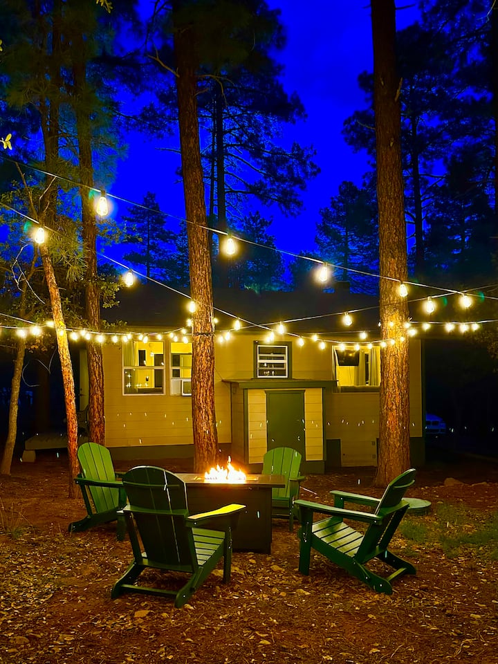 走出房源,即可抵达您的私人后院森林,森林下有Ponderosa和Juniper松树,配有Adirondack椅子、咖啡馆灯串和火坑。 烤棉花糖、观星,或只是在亚利桑那州的天空下聆听松树的低语。 还有一个烧烤架,可供户外用餐,还有充足的场地,可供草坪游戏或与您的狗一起放松身心。