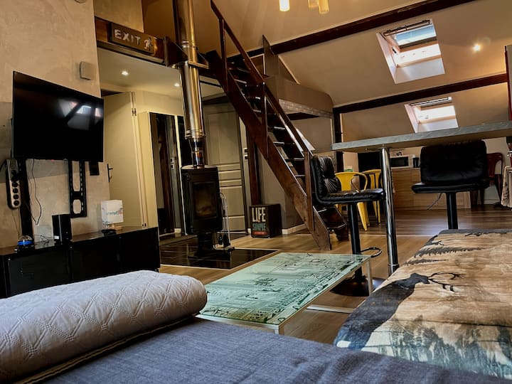 设有迷人的夹层,配有舒适的睡眠区、带燃木炉的温馨客厅、设备齐全的厨房和优雅的卫生间。