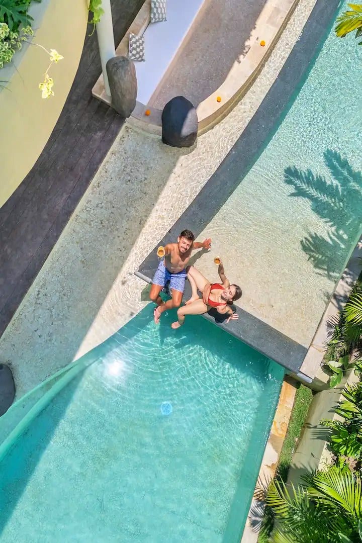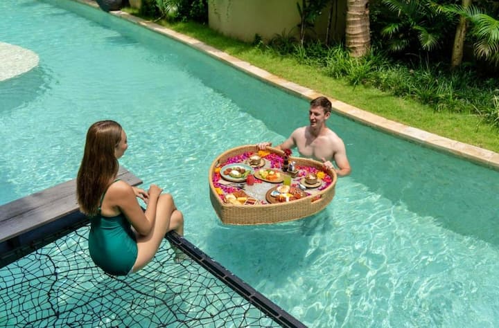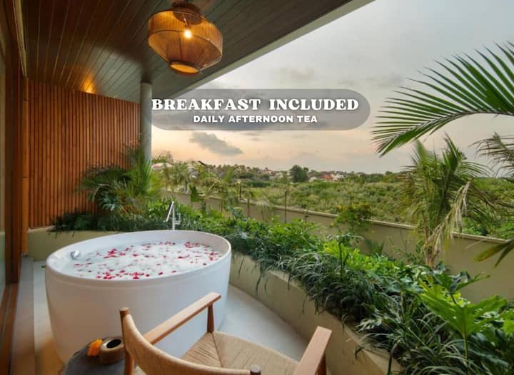 这间双人套房位于巴厘岛水明漾市中心的高档度假村内,经过精心设计,旨在让您放松身心,尽享时尚,配备迷人的户外浴缸、舒适的床上用品和现代化的便利设施,确保您拥有舒适的住宿体验。