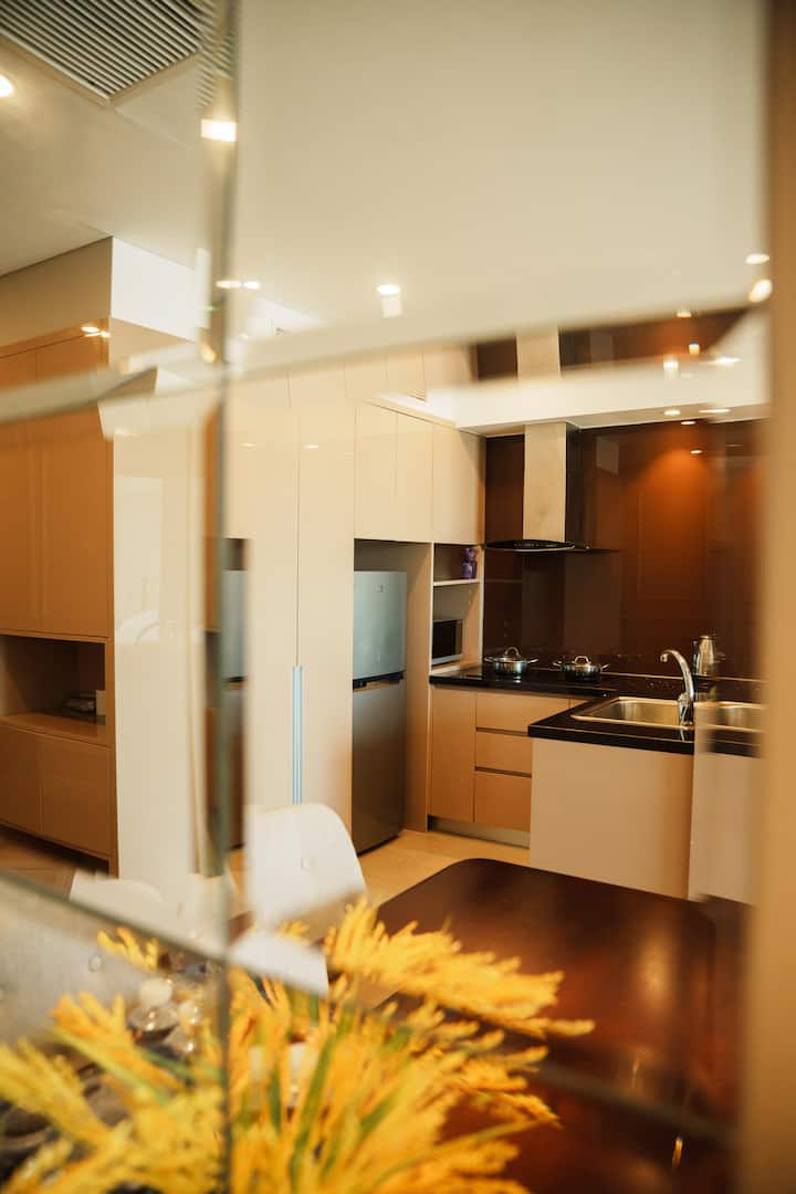 -厨房设备齐全:电磁炉、抽油烟机、微波炉、超速水壶、冰箱、电饭煲、锅具、平底锅、杯子、碗碟等烹饪用具。 您可以在公寓内为家人烹饪。