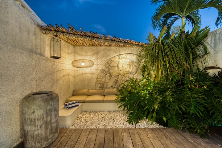 🌊 户外区域/泳池: 步入您的私人绿洲,这里设有铺有绿松石砖的泳池(约22平方米),配有浅水休息区和内置石凳,顶部有毛绒床垫。 周围环绕着迷你热带花园,是您品尝鸡尾酒、享用漂浮早餐或以时尚方式沐浴巴厘岛阳光的完美场所。 🌿