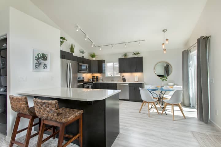 •设备齐全的现代化厨房,配备不锈钢家电和石头台面