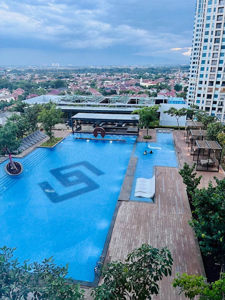 全新现代单间公寓,就在AEON商场Tanjung barat上方,享泳池景观和高楼层。 最少入住3晚。全新家具和电器。 适合远程工作,配备时尚的加长工作台和30mbps的快速互联网。 除了泳池景观外,您还可以在早晨欣赏萨拉克山的美景。 夜间,您可以从窗户和小阳台欣赏到迷人的城市天际线灯光。