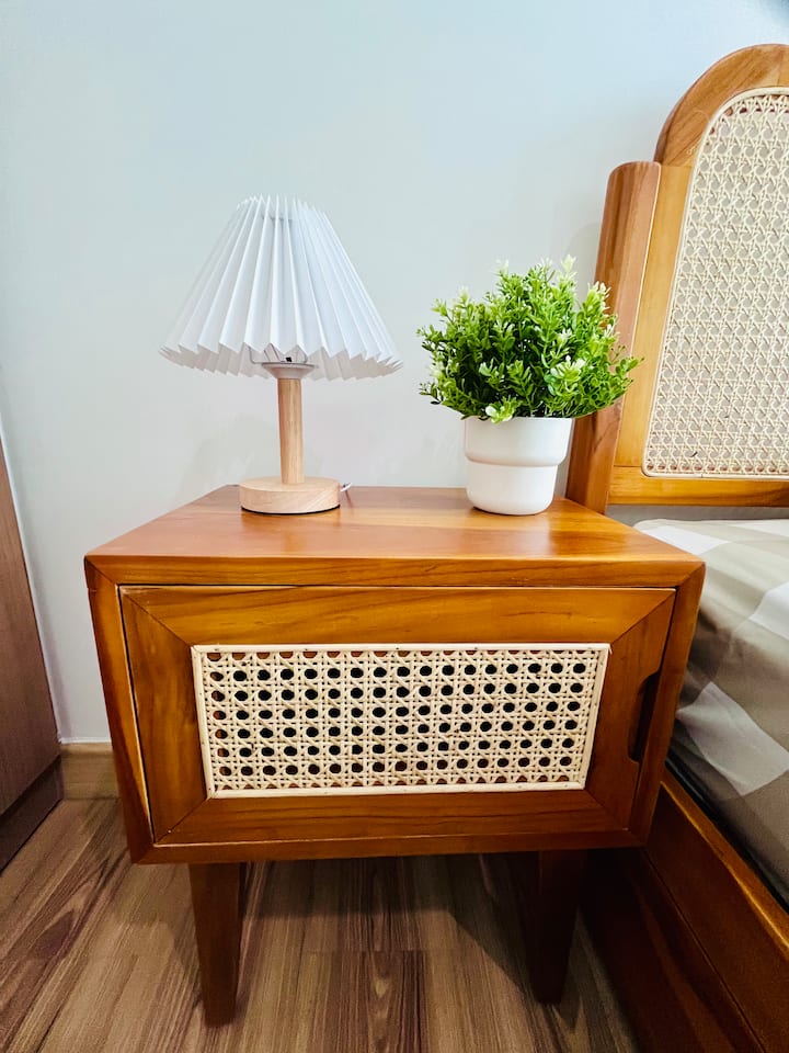 这间单间公寓卧室采用现代斯堪的纳维亚主题,并融合了一些印度尼西亚木工工艺。 所有家具都是全新的!