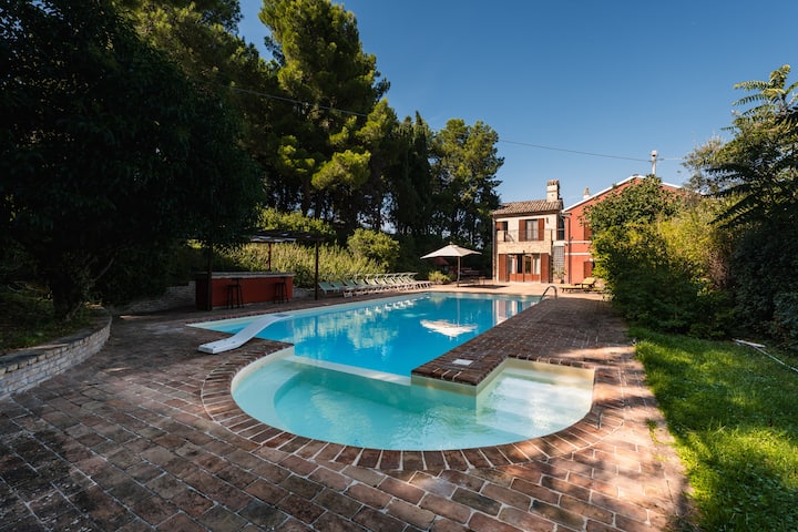 探索阿黛尔别墅:马尔凯的豪华别墅,设有私人泳池,可欣赏亚得里亚海的景观,沉浸在家族世代相传的百年松树林中。 内置陶土地板、外露横梁、房间(也带套间浴室)、带壁炉的起居室和全景阳台。 45,000平方米的围栏公园,设有烧烤区,提供午餐。