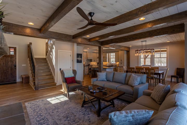 从进入的第一步开始,您会爱上湖景,距离前甲板仅几码。 大型观景窗意味着您可以同时享受遥控燃气壁炉、电视和不断变化的湖景,后面是祖父山。 外露的做旧横梁让人联想到山间小屋的风格。 餐厅可轻松容纳6人,岛上还有更多空间。 厨房里有一个铜制农舍风格的围裙水槽、活边深色皮革花岗岩、所有不锈钢电器,包括煤气灶、Keurig和标准咖啡机。 厨房外面是洗衣间,配有水槽,方便清洁。