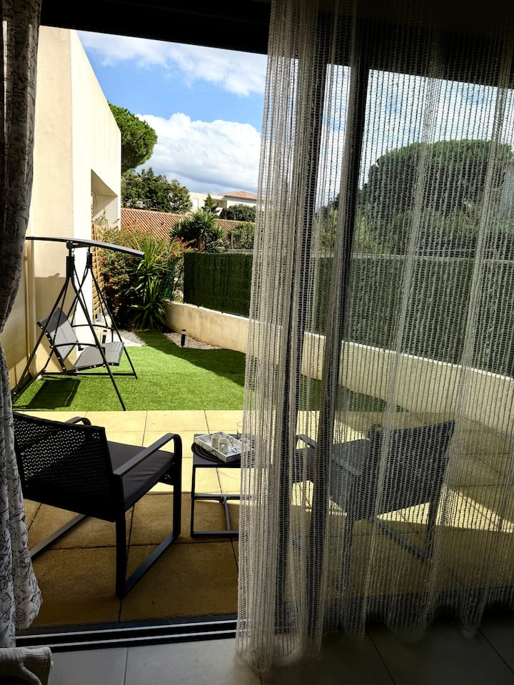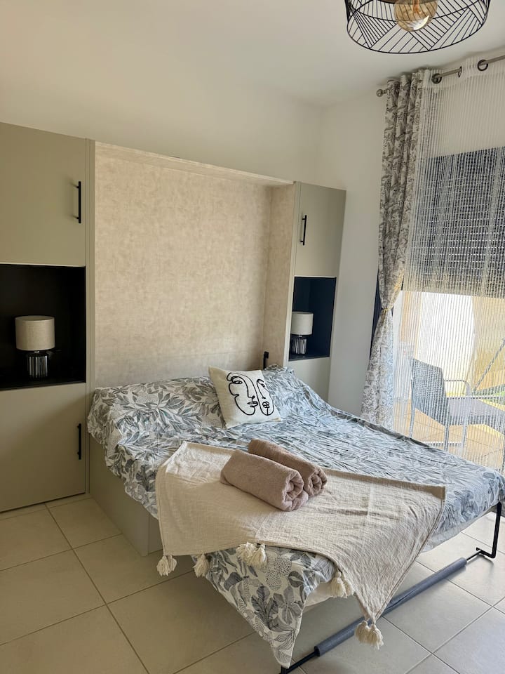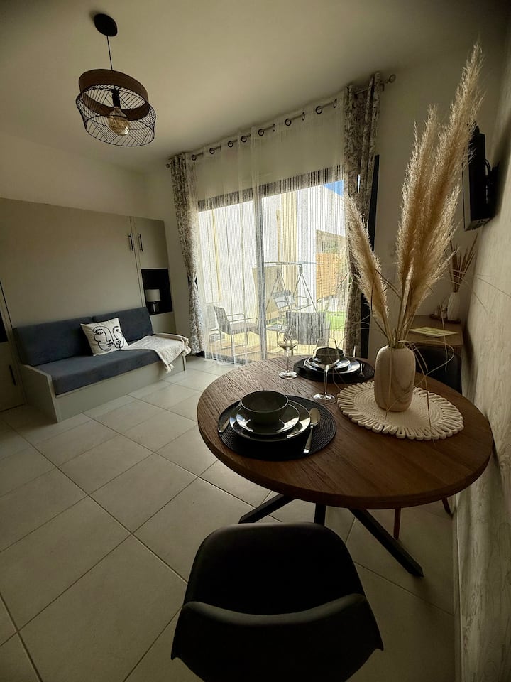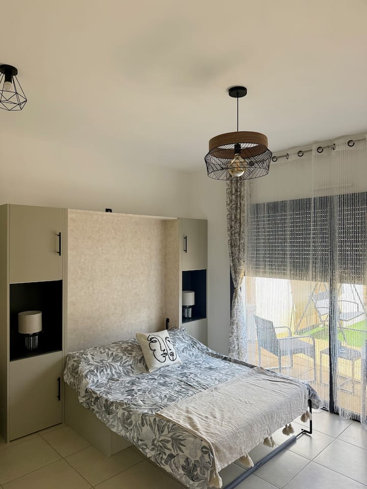 带花园和停车场的单间公寓,距离卡尔维海滩150米