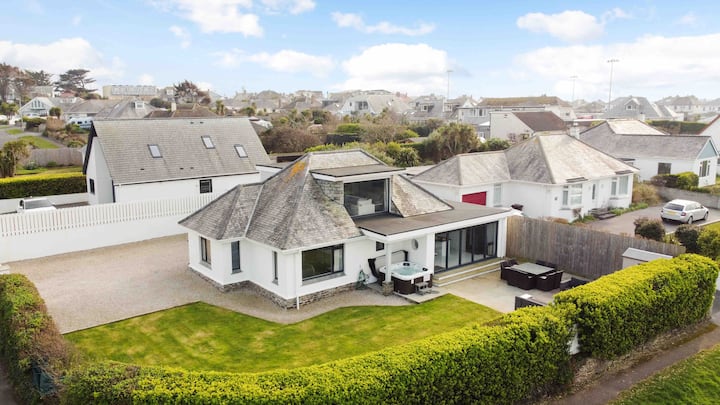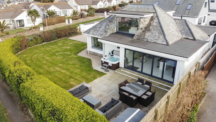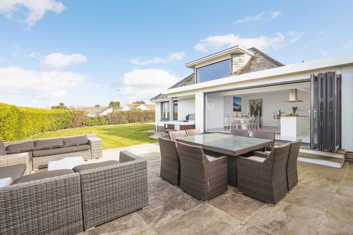 房源由4间加大双人床卧室组成,均配备埃及棉质家具和40英寸智能电视。除了豪华的家庭浴室外,这栋房子还设有3间套房电淋浴间。楼上的全景海景休息室地理位置优越,可俯瞰Watergate Bay和Porth Beach的岬角美景,是您欣赏55英寸智能电视的理想场所。楼下,现代化的开放式厨房和用餐区配备了博世电器。这里的时尚设计体现在菲利普·斯塔克风格的幽灵椅、时尚的白色玻璃餐桌和花岗岩效果的台面岛上。厨房的双折门通往花园露台和大型Alexander Francis Rattan户外家具,非常适合露天用餐。