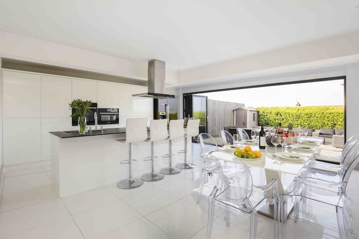 楼上设有全景海景起居室,可俯瞰水门湾( Watergate Bay )和波斯海滩( Porth Beach )的广阔岬角,是欣赏83英寸4K智能电视的理想环境,配有Sonos环绕电影音的音乐。 楼下,现代化的开放式厨房和用餐区配备了博世电器。 在这里,时尚的设计与Philippe Starck风格的鬼椅、时尚的白色玻璃餐桌和花岗岩效果的工作台岛屿相得益彰。 双褶门横跨厨房,通往封闭式花园,花园设有露台、宽敞的Alexander Francis Rattan休息室座位和8位房客的餐桌和椅子,非常适合露天用餐。