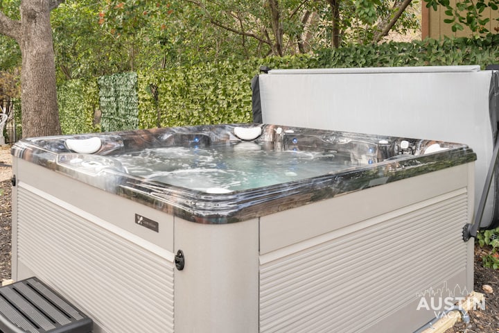 ✦后院幸福:热水浴缸、露台和烧烤:带顶棚的露台兼具舒适性和功能性,可供户外用餐和休闲。 您可以沉浸在冒泡的热水浴缸中,在不锈钢燃气烤架上烤牛排,或在池畔享用户外用餐。 遮阳篷让白天保持凉爽,而柔和的夜光为橡树下用餐创造了轻松的环境。