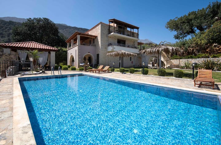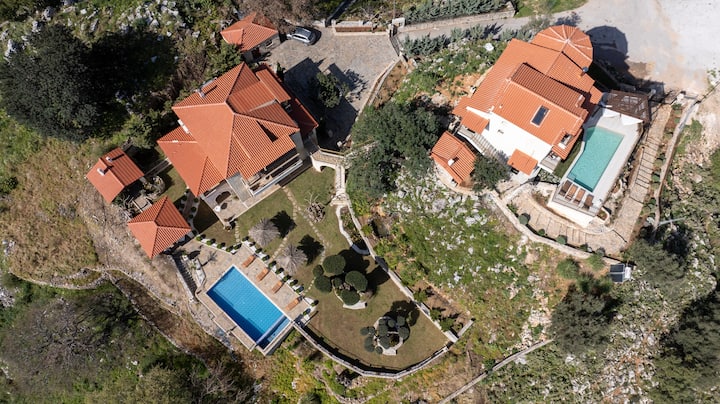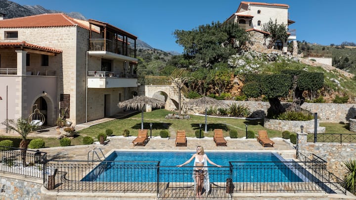 位于哈尼亚阿波克罗纳斯的豪华别墅,设有九间卧室、两个独立泳池和宽敞的户外区域,非常适合瑜伽度假、活动、婚礼、派对和宁静度假。 这两栋独立别墅位于宁静的传统村庄Embrosneros,融合了现代优雅与纯正的克里特岛魅力,周围环绕着橄榄林和宁静的乡村,可欣赏壮丽的海景和山景。