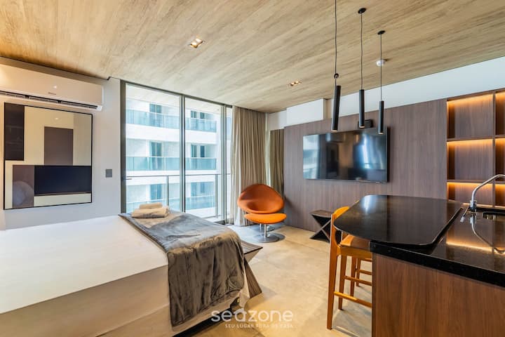 这间现代精致的单间公寓位于Pajuçara,配备一张标准双人床、空调、智能电视、设备齐全的厨房和一个令人惊叹的阳台,可欣赏侧面海景。 大楼设有健身房、泳池、桑拿房等。 地理位置优越,可轻松前往海滩、工艺品市场以及知名酒吧和餐厅。