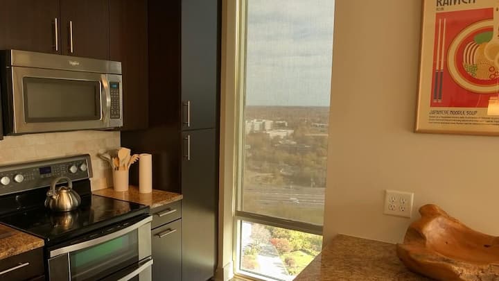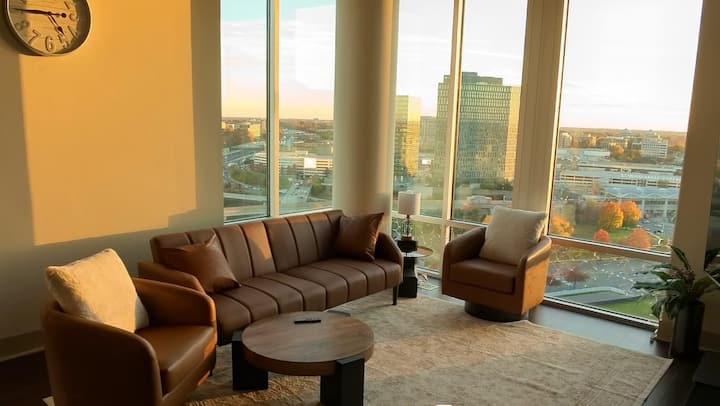 这套现代化的2卧2卫公寓拥有明亮的开放式布局、时尚的家具和城市景观。 配备设备齐全的厨房、房内洗衣机/烘干机,享受酒店式舒适体验。 房客喜欢这个5星级的位置,步行即可轻松抵达泰森斯角中心和泰森斯画廊。 乘坐地铁前往雷根国际机场(IAD)或从机场出发,不到45分钟即可到达。