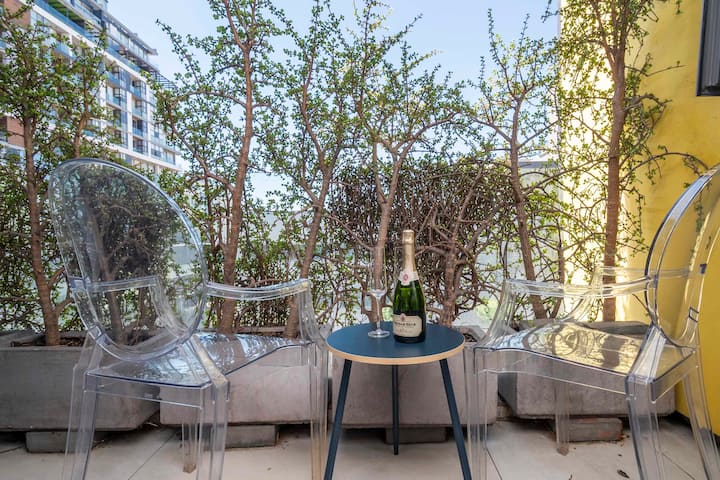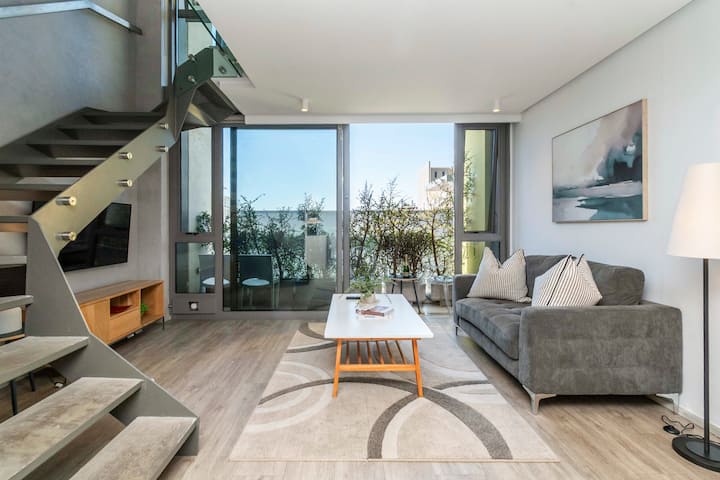 楼下的开放式起居区设有设备齐全的厨房,配备优质电器,方便您准备美食或享受宁静的夜晚。 休息室通往私人阳台,您可以在阳台上品尝晨间咖啡或欣赏城市夜景。