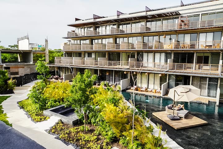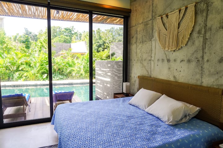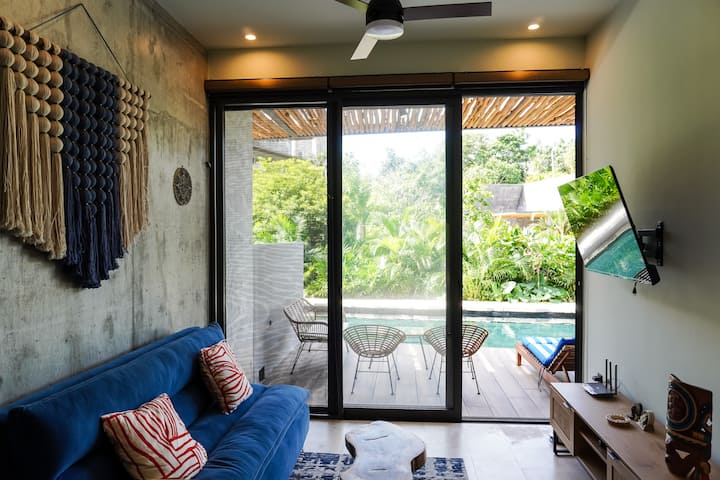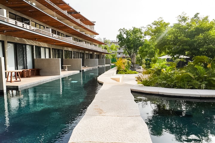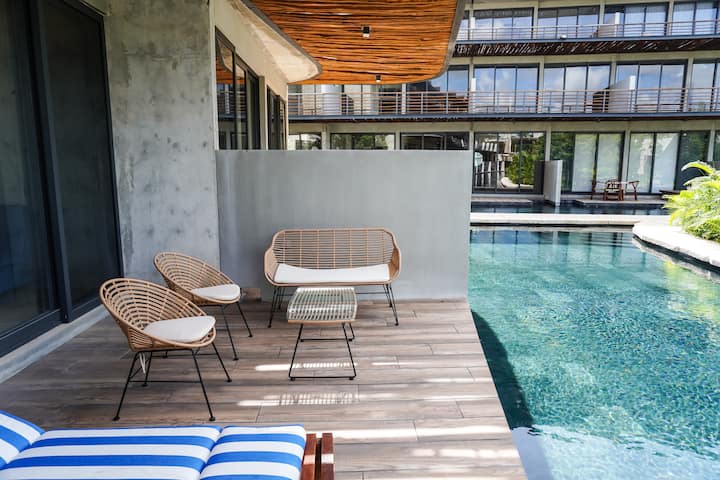 粗犷主义风格2卧公寓,带露台,可通往无边河畔泳池