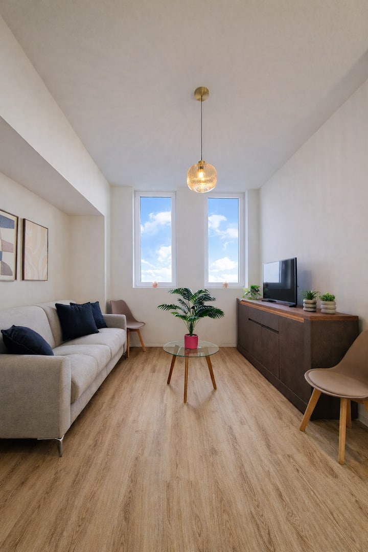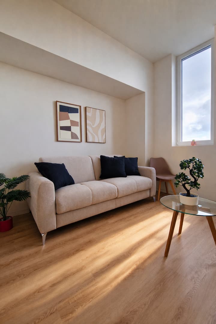 客厅宽敞实用,配有舒适的沙发。 智能电视和空间的布置使其非常适合夜间放松、欢聚或远程工作。