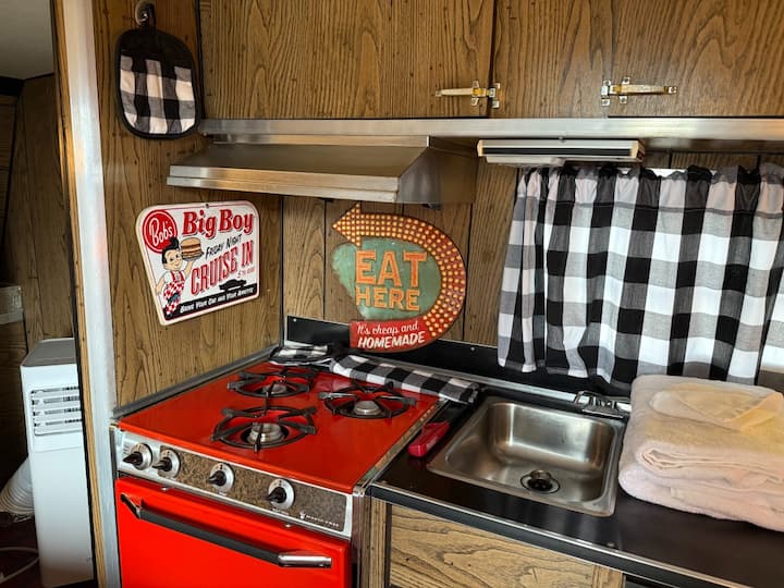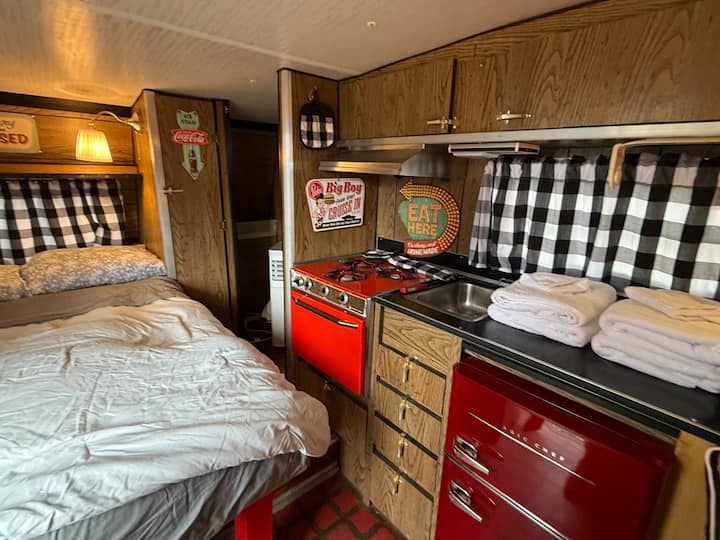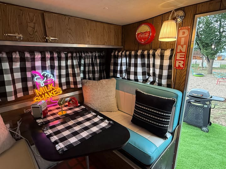 走进Ruby 's Diner,这是一辆欢快的复古露营车,灵感来自经典的路边餐厅。 这间舒适的房源配备了全尺寸床垫、空调、暖气、迷你冰箱和基本餐具。 在室外享用烧烤架、野餐桌、躺椅和火坑。 Ruby 's Diner使用我们附近的浴室,配备现代化的淋浴间和卫生间。 房客还可以享受季节性泳池、游乐场、庭院游戏和我们标志性的复古加油站照片拍摄点。