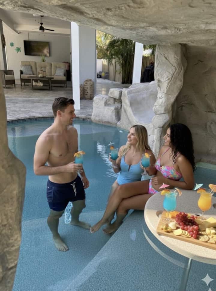 私人房源,带加热的石窟泳池,距离海滩仅几步之遥。