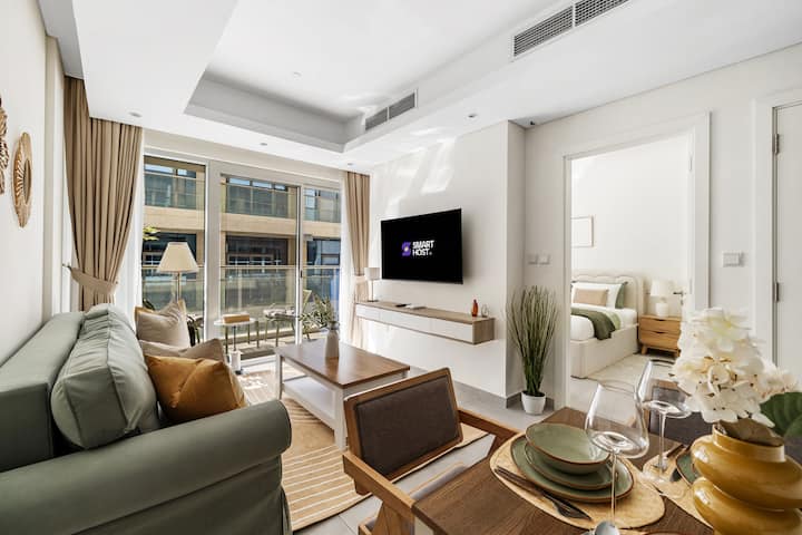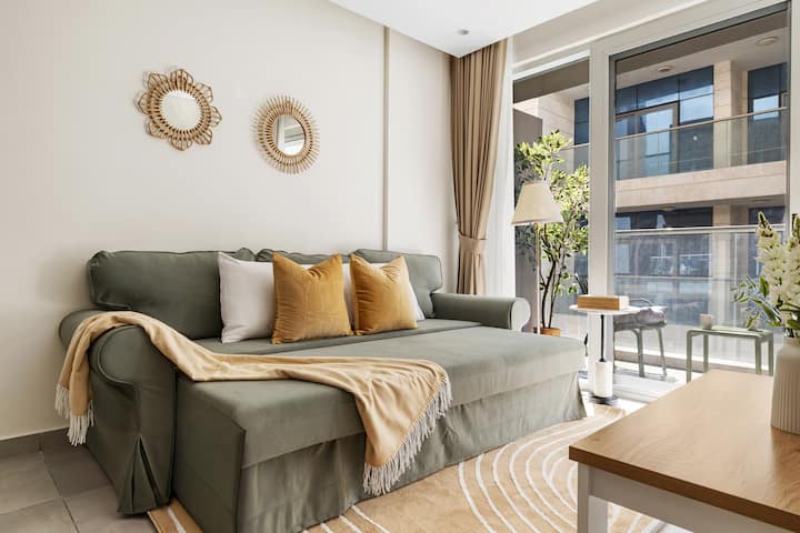 -起居区:在宽敞的沙发上放松身心,同时在平板智能电视上欣赏您最喜爱的节目。 开放式布局轻松融入餐厅和厨房区域,营造出明亮温馨的空间,是放松身心的理想之选。 只有提前提出要求,我们才会准备沙发床。 如果您计划使用它,请在抵达前告知我,以便我确保为您设置。 如有需要,可提前申请沙发床的额外床上用品,价格为140迪拉姆。