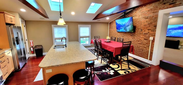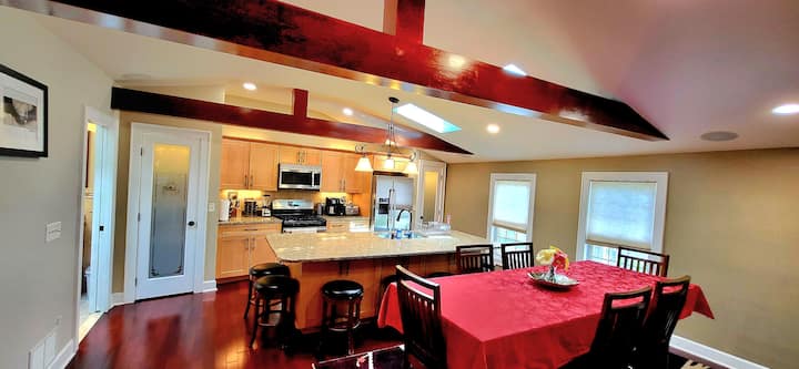 • 厨师厨房配备不锈钢家电、储藏室、宽敞的高端枫木橱柜、4英尺x 10英尺中央岛屿(可容纳10人)、全新锅具和平底锅、盘子/玻璃杯/银器以及各种其他厨房用具、餐具、香料等