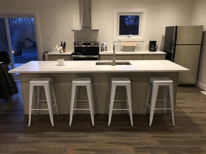 包括设备齐全的厨房(包括冰箱、烤箱、烤箱、洗碗机、微波炉、咖啡机(请自带胶囊)、搅拌机、烤面包机、玻璃器皿、餐具等)、早餐吧、用餐区(最多可容纳8位房客)、座位区,配备智能电视( Netflix、亚马逊Prime等)。