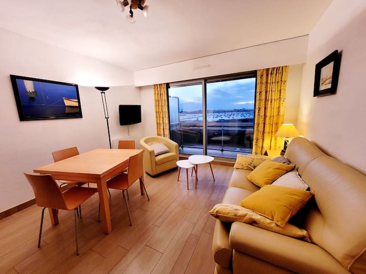 公寓靠近市场、停车场和港口景观