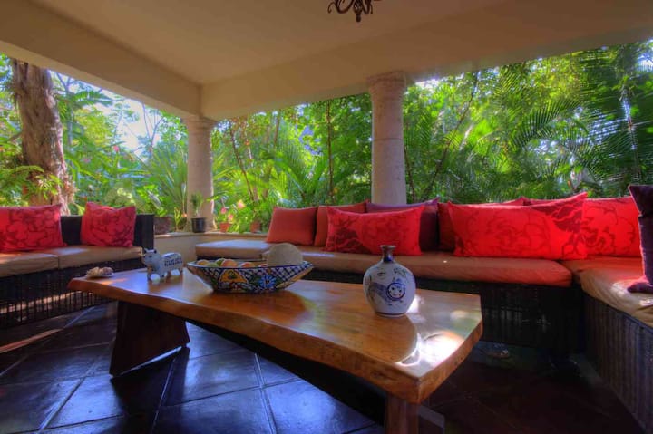这栋美丽的别墅坐落在蓬塔埃尔库斯托迪奥( Punta El Custodio )的最高点,坐落在树木和花园中。 它采用现代风格,体现了古老的庄园,被其建筑师描述为「赤脚优雅」。 从客厅/餐厅/厨房的大房间,您可以四处欣赏郁郁葱葱的花园和大海,因为一楼设有柱廊,通向空气。 其业主将唐胡安之家( Casa Don Juan )视为第二个家,并用有趣的墨西哥文物和绘画装饰它。 这里还有一个大型图书馆,可能是周围最大的图书馆。 4间独立的卧室,每间均配有全套浴室和迷人的景观。 楼上的两间卧室设有私人露台,还有许多露台,您可以在美丽而异国风情的植物园中找到阳光、阴凉和宁静。 室内庭院花园的中心设有一个浸泡池,坐落在岩石和郁郁葱葱的树叶中,类似于清澈的泉水。 (我们不加热,所以冬天有点加热,虽然炎热的夏天很清爽。)