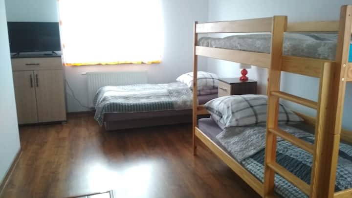 1 张约 1.35 米宽双人床、1张双层床