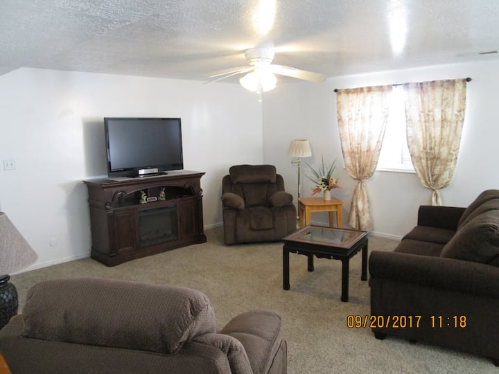 我和妻子喜欢划船和钓鱼。 我们还会每周跳两到三晚。 我们有一英亩的草、花、灌木和树木。 我们有一个美丽的喷泉和美丽的愿望井,充满了鲜花,有水从中流出。 我们有一个很棒的露台和烤架供您使用。 我们还设有一个温室和四只鸡。 我们有一个美丽的房源,有一个婆婆公寓,有自己的入口,家具齐全,装潢舒适。 我们提供高速互联网(光纤) ,带Roku的Netflix等。 AT&T、T-Mobil和Verizon都能很好地在我们地区以及其他区域。 我们非常靠近三个滑雪胜地,开车1小时即可抵达更多滑雪胜地。 我们距离Golden Spike Arena牛仔竞技场仅几个街区。 我们附近还有两条很棒的河流可供钓鱼,附近有湖泊可供划船活动和钓鱼。