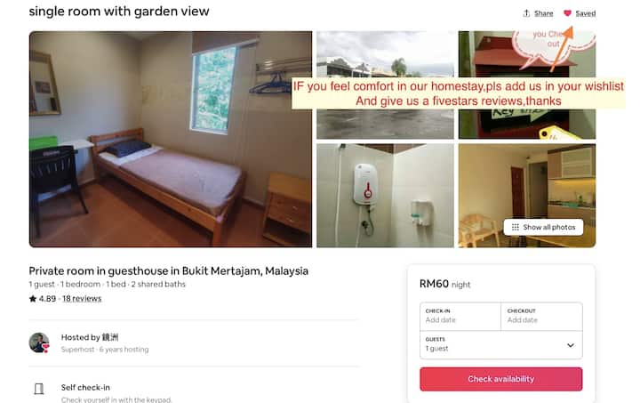 马来西亚槟城大山脚(Bukit Mertajam)的客房里的独立房间