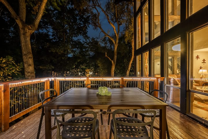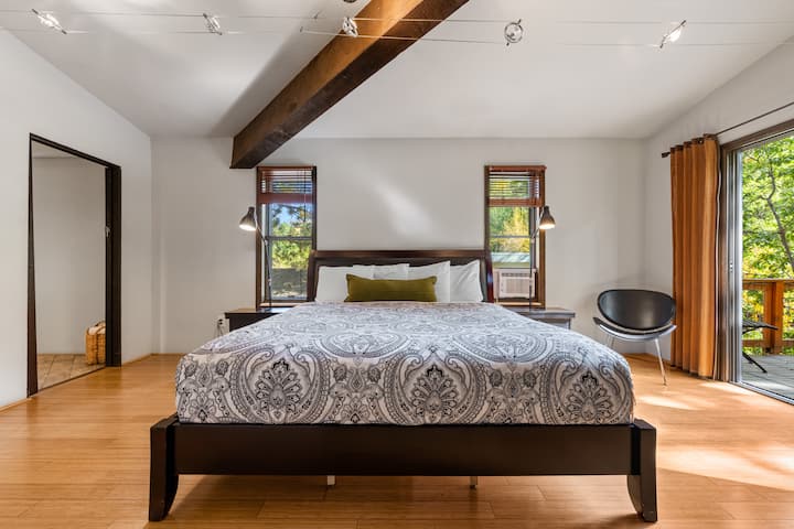 欢迎来到Stream Retreat,这是一个宁静的Manitou Springs度假胜地,建筑与自然融为一体。 这栋房子坐落在棉白杨和花岗岩巨石之间,位于一条全年温和的溪流之上,平静的声音穿过树林进入起居空间。 您可以在露台、户外用餐区,甚至在室内透过三层窗户欣赏流水的宁静节奏,窗户让房源充满光线和森林景观。