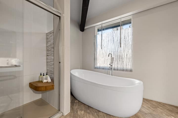 楼上的次卧室和两间主卧室均配有带枕头床垫的标准双人床、柔软的床单和舒适的极简设计。 楼上的浴室配备了船形洗手池和浸泡式浴缸,而主层的浴室则配备了定制的混凝土洗手池,并点亮了闪烁的光纤“星光”。