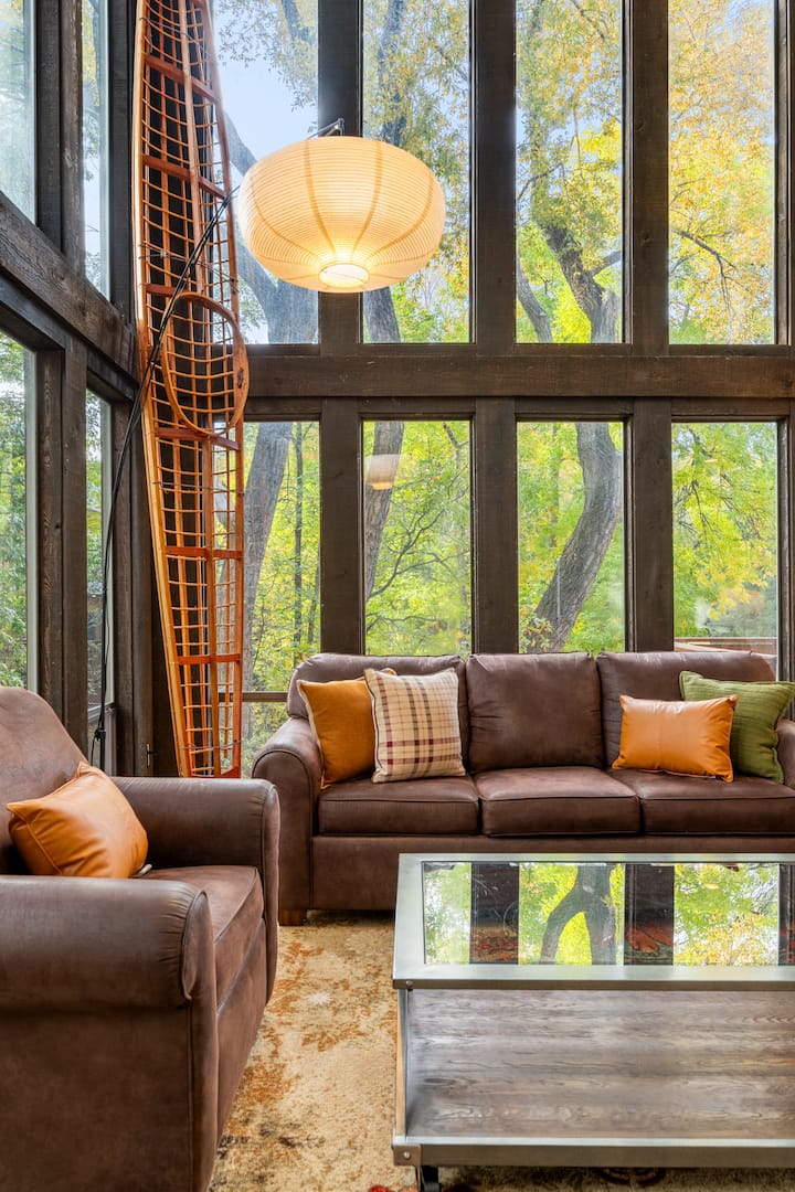 主客厅是房源的中心,三层窗户可欣赏树顶景观和下方溪流的声音。 您可以坐在豪华的皮革座椅上,在智能电视上观看您最喜爱的节目,或在电壁炉的光芒下放松身心。 开放式布局与厨房和用餐区无缝衔接,让每个人都能近在咫尺,同时仍然留有呼吸空间。