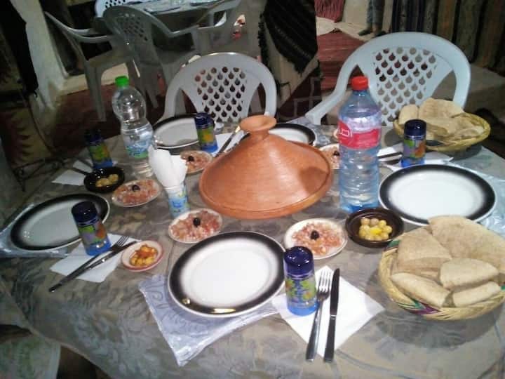 与我的家人一起,我们将以纯粹的摩洛哥传统欢迎您,我的妻子炖了传统美食,这是一种融合了柏柏尔文化和摩洛哥艺术的非典型装饰。在传统客房的一侧,我们在传奇雪松森林( Le Cèdre de Gouraud )的中心提供一个大型柏柏尔风格的帐篷,可俯瞰Ougmes的景观。