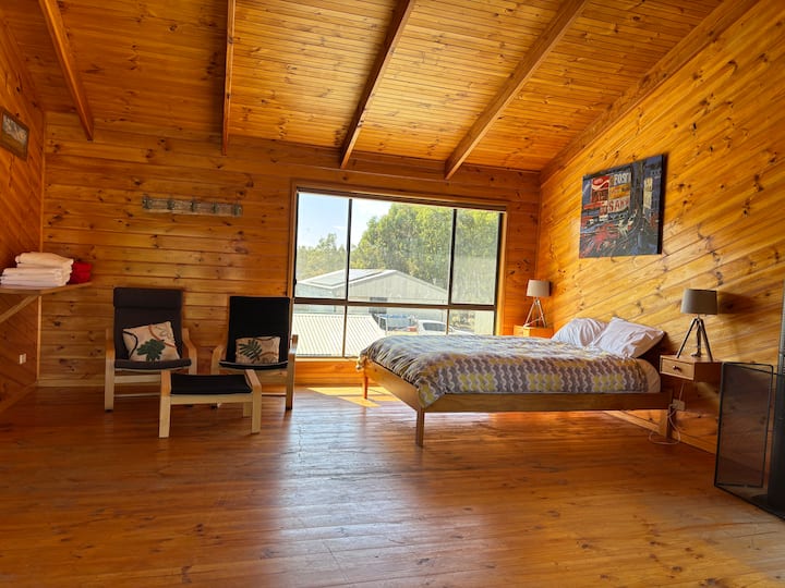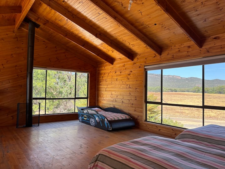 楼上是一个有4张床的度假屋(标准双人床加3张单人床-一张单人床是儿童的「汽车」床,另一张实际上是加大双人床)。 这个空间设有五个广场,包括宽敞的起居区和带卫生间和淋浴的独立卫生间。 这是一个完美的光线充足的区域,您可以在黄昏和黎明时分欣赏壮丽的景色或观赏许多袋鼠。