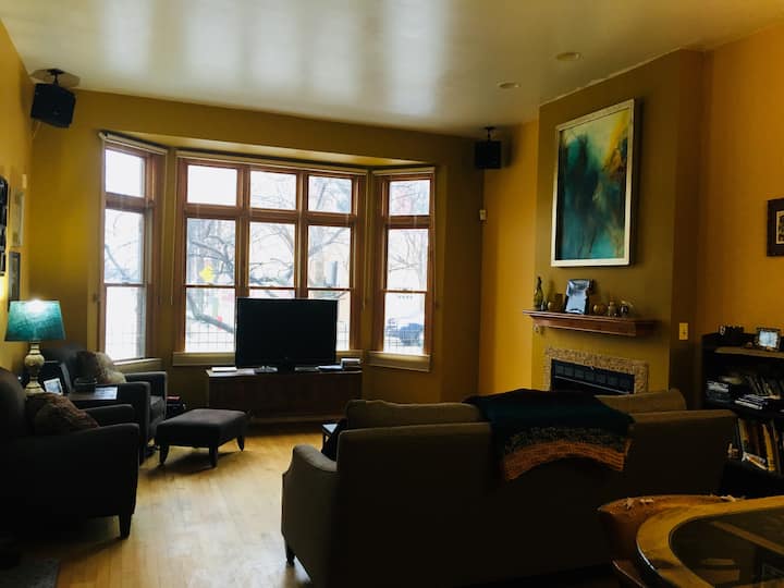 整层楼都是您的——您可以独享整层楼!整层地下室,配备玻璃滑动门、1.5间独立卧室和2张书桌。干净整洁-每位房客退房后,我们都会进行蒸汽清洁!全新记忆泡沫常规标准双人床,另外2张标准双人气垫(应要求提供)。开车前往市中心需7分钟,或者开车前往火车站/公交车站,两者均可前往市中心,仅2个街区。可提供街边停车位。